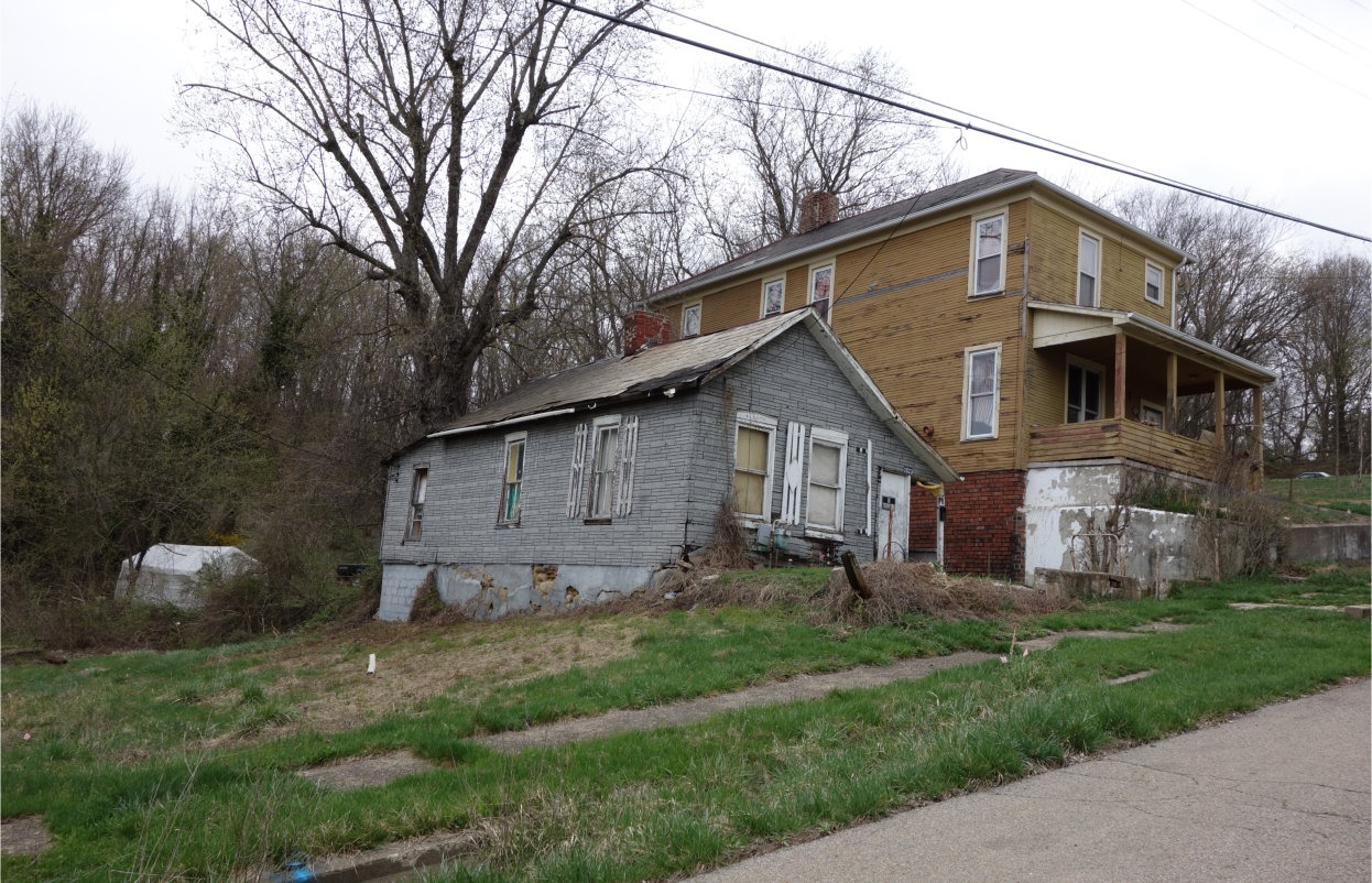 Indeed, the sky looked much as in the below picture, grey and overcast, as it was for pretty much all of my April 2013 excursions—I couldn’t catch a sunray with a net most of the time. Still, the small house looks nice against the backdrop of that grey sky. These two houses are additional examples of the Ohio Lawn Care Frenzy to which I earlier alluded. This photograph also contains an example of a phenomenon that I encounter occasionally on these trips and which I find utterly dumbfounding: the use of miniature outhouses as lawn decorations. Just think about that. Somehow a toilet facility has become cute in American pop culture. ![]()