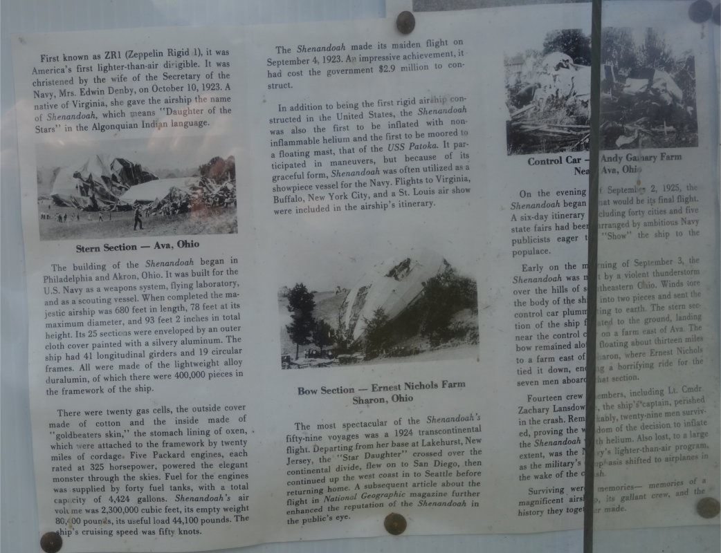 By this point, my meanderings had taken me to far southeastern Ohio, near the tiny hamlet of Ava.   Driving down one road, I saw an old camper which seemed at one point to have been used as a de facto billboard, though it was now tucked away.  On it were painted the words “U.S.S. Shenandoah.”  This tickled the back of my brain but I couldn’t place it.  Soon, however, I came across a small roadside sign pointing down a road and announcing the direction of “U.S.S. Shenandoah crash site 2.”