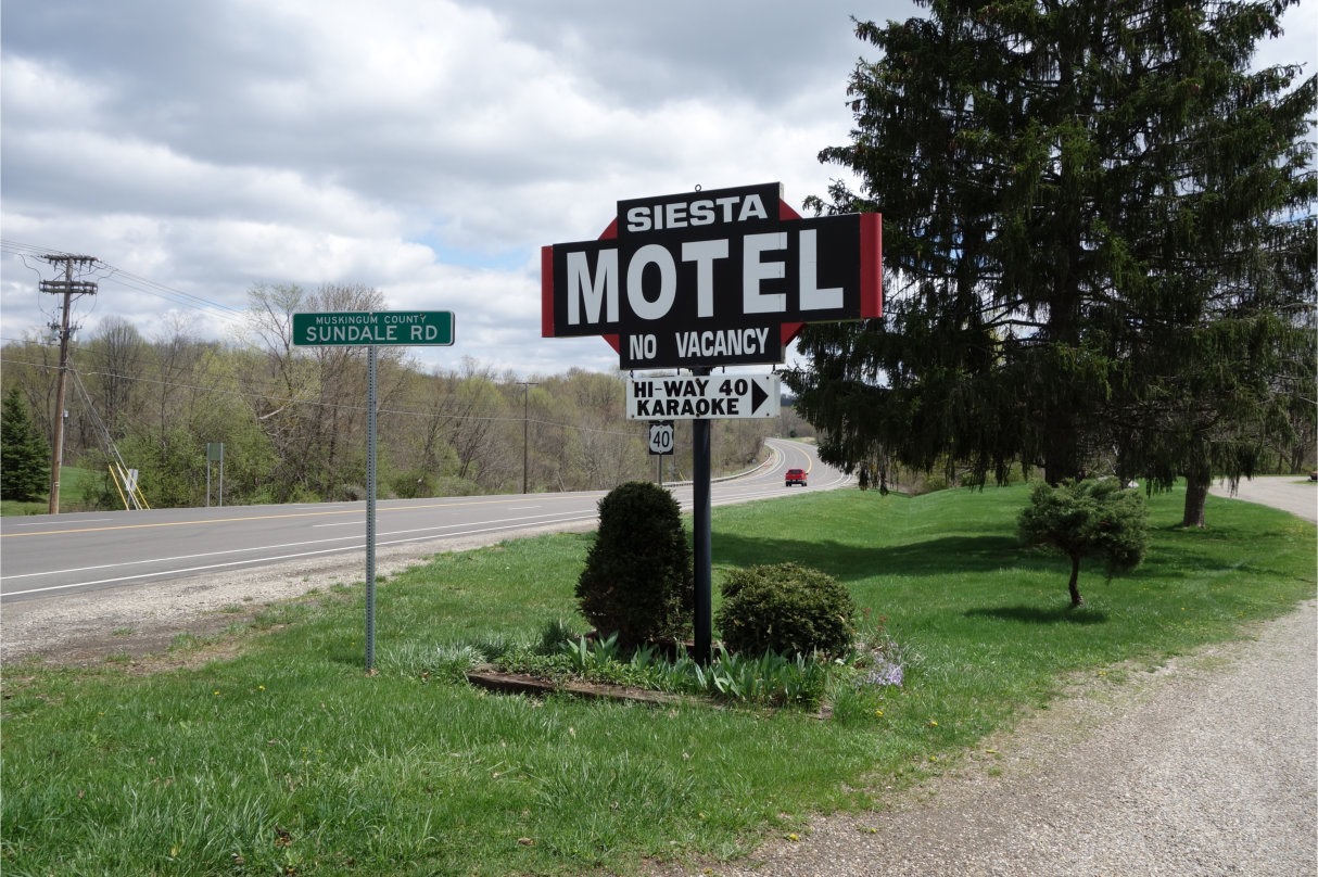 Once past Zanesville, continuing eastward on U.S. 40, I immediately began coming across old motels again, relics of the beautiful nostalgic time between the 1920s, when travelling by car became common in America, and the 1950s, when the Interstate Highway System began to suck up all of the nation’s cross-country traffic, leaving the old motor hotels as dry as a farm after the river shifted course.