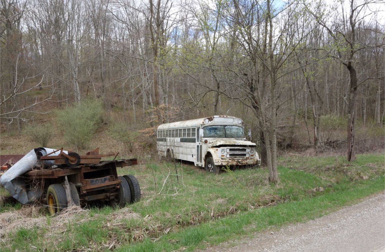 I turned off the National Road at one point, to take a little zig down to the Ohio River. Coming over a slight rise, I encountered this scene in the depression below me. This is not uncommon in rural Ohio, where someone will own land on both sides of a road and will use one side of the road for a house and the other side for a barn or stable or equipment dump or junk yard. This ramshackle example is just one of probably thousands.