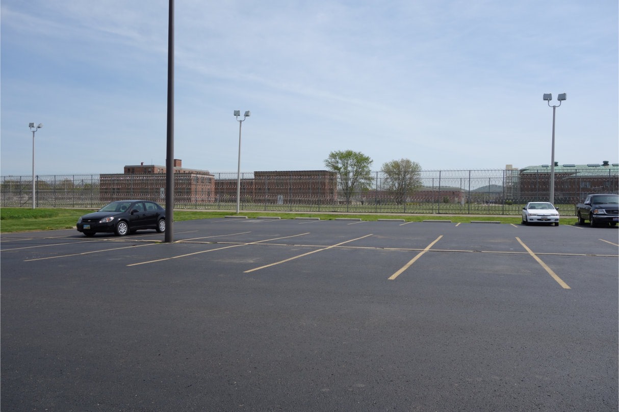 The chain link fences make it hard to see the prison beyond. To get a better view I would have had to go right up the outside fence and taken pictures through it, but this might have attracted the ire of prison officials (I was chased out of a prison parking lot once before, even though I had not even left my car). You can see that there are prisoners here walking around outside, perhaps reflective of the lower security status.