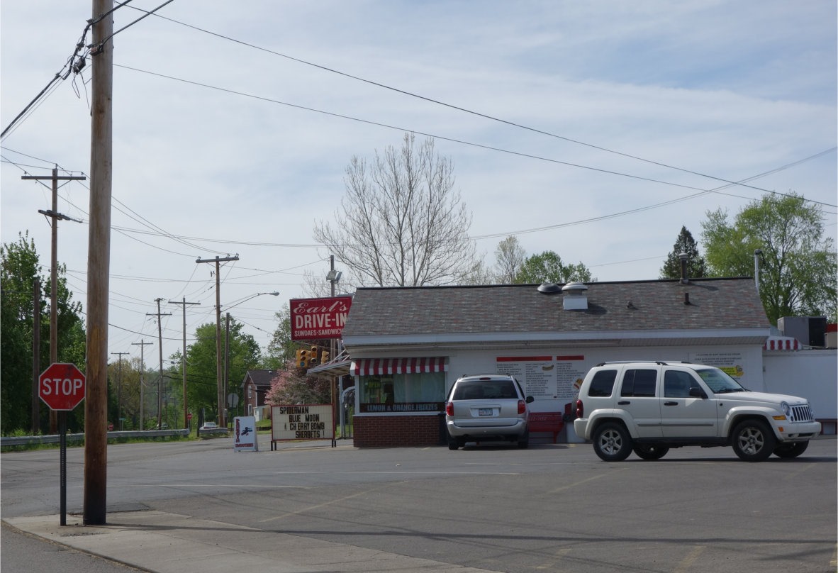It would hardly be an Ohio town if it didn’t have an ice cream shack in it, so here is Earl’s Drive-In, started by “Earl & Becky.” As of 2011, the building had a penguin on its side, but that has been painted over.