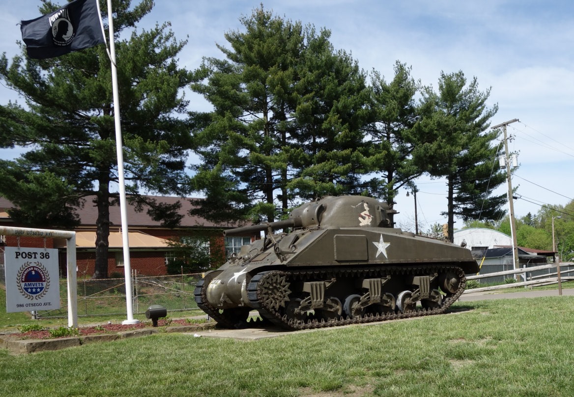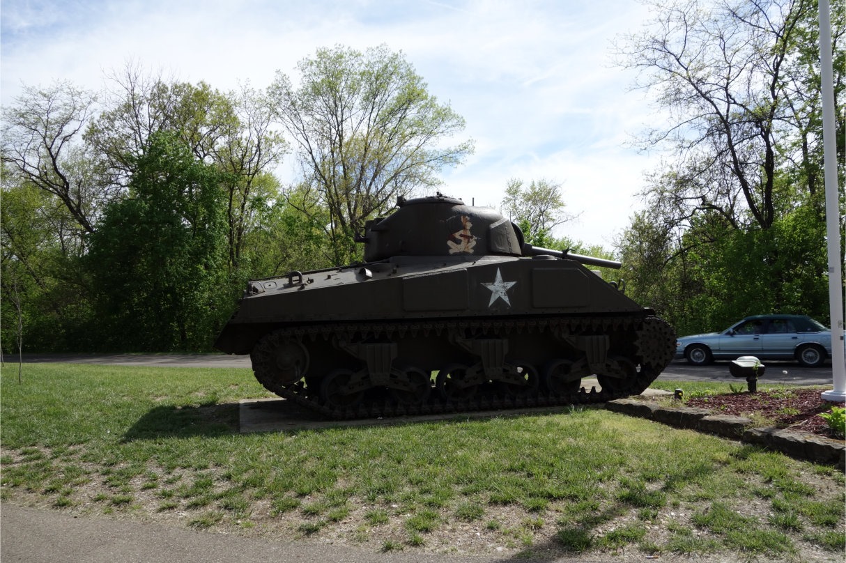 To my surprise, I came across an Amvets Post as well, which featured a Sherman tank. Keep in mind that earlier that day I had come across an Amvets post in Columbus, which also had a Sherman tank on display, so I saw two Sherman tanks in one day, separated by nearly 80 miles! This tank is identified (whether accurately or not, I don’t know) as having been part of the 37th Reconnaissance Troop, which was part of the 37th Infantry Division, a division formed largely from the Ohio National Guard which fought on New Georgia, Bougainville, and Luzon in World War II. Recon troops typically had halftracks and light tanks, but perhaps by the time it was on Luzon in the Philippines in 1945 it had some Shermans (a medium tank) as well.