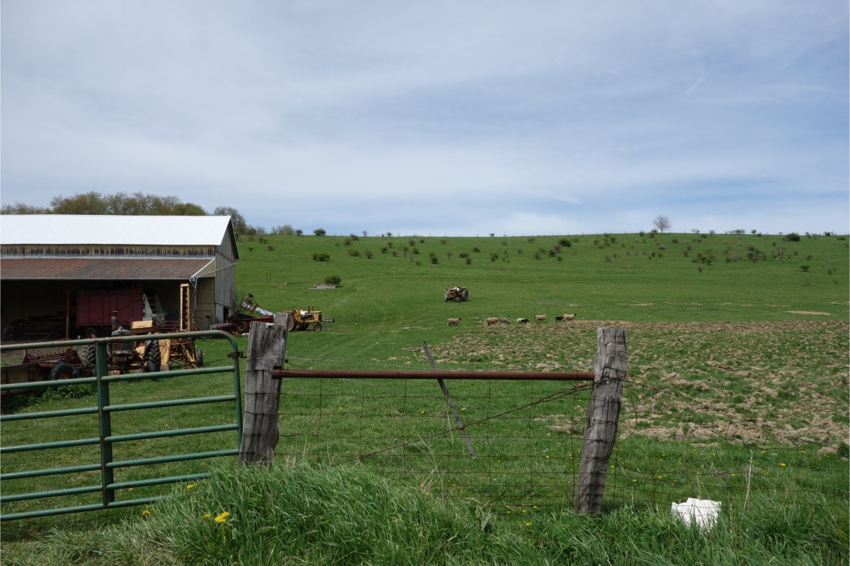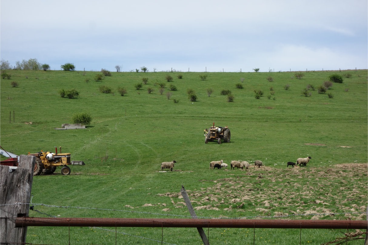 This shot shows sheep and is a favorite photograph of mine. What I like so much about it is how well it shows depth. You can really point to at least five depth levels here. There is the immediate foreground, as delineated by the fence, then the near foreground, which is the rocky area with the sheep. The tractor occupies the center ground, then behind it is the scrub on the rising terrain. lastly, more scrub and fenceposts mark the horizon. That’s a lot of depth for a two dimensional picture. If you look closely, you can see some birds on the ground in the center, eating worms or somesuch. ![]()