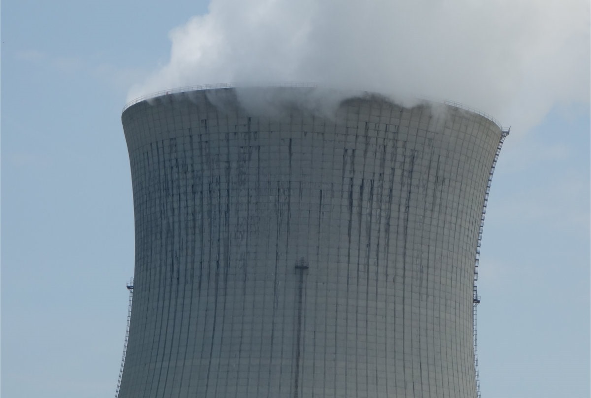 The nuclear facility structures are cooling towers, where the heat from condensed steam is extracted from the cooling water system. The ladders you pointed out, at least the ones that go up the last third of the way to the top, face outward. This makes for spooky climbing as each step feels like a step into open sky