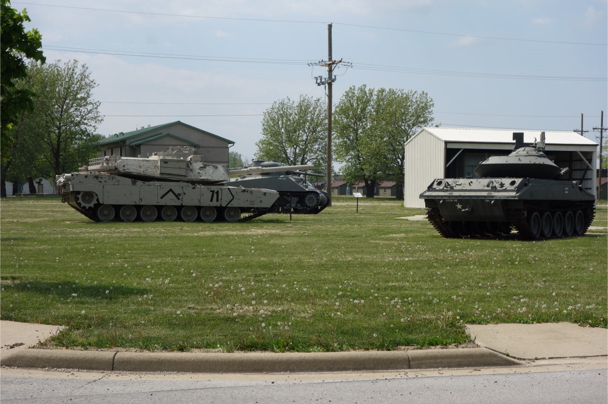 exc8pt5-3 In a couple of spots on the base, military hardware is displayed.  Here a modernish M1 (or M1A1, I can’t tell the difference) Abrams tank is in front of a World War II era Sherman.  I think the tank on the right is a Viet Nam era Sheridan.