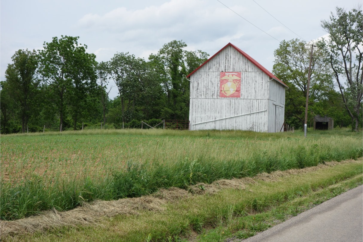 exc9pt3-12 Most decorated barns that one sees have advertisements for some form of tobacco on them.  Occasionally you may also see a sports reference (Ohio State University and, oddly, the Pittsburgh Steelers being the ones I have so far seen most often).  Only once in a while will you find some other sentiment expressed on a barn, as in this example, presumably put there by a Marine Corps veteran.