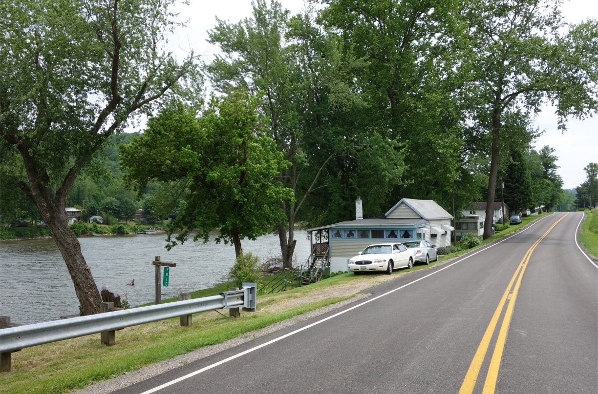 exc9pt3-14 At some point in my meanderings I started driving alongside the Muskingum River, a significant tributary of the Ohio River and probably the most important river that goes through Southeast Ohio.  In times past, the river was a significant commercial waterway (and also an Underground Railroad route); today its uses are basically recreational.  As I have noted in earlier entries (see the tag “river shack”), some of Ohio’s rivers are lined with permanent or semi-permanent small housing designed for recreational river purposes:  fishing, boating, or just lying around.  the subject painted on the above striking river shack is managing to do all three.