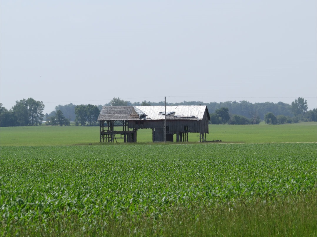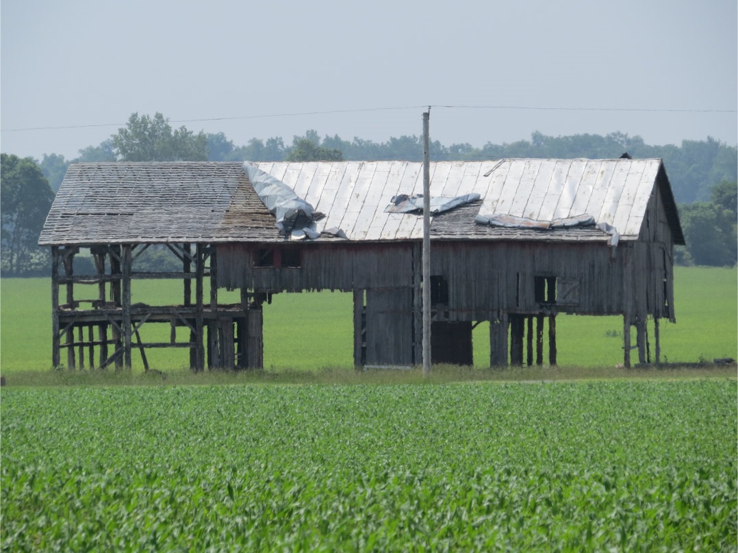 Not long after passing by Dianne’s, I came across a very odd site: in the distance, I could see the skeleton of a barn poking out of the fields of young corn. Although the roof looked intact (though in fact it is not), it was strangely missing most of its sides, making it look as if it were elevated on poles. The barn was quite distant, but the zoom capabilities of the SX50 allowed me to capture it reasonably well.