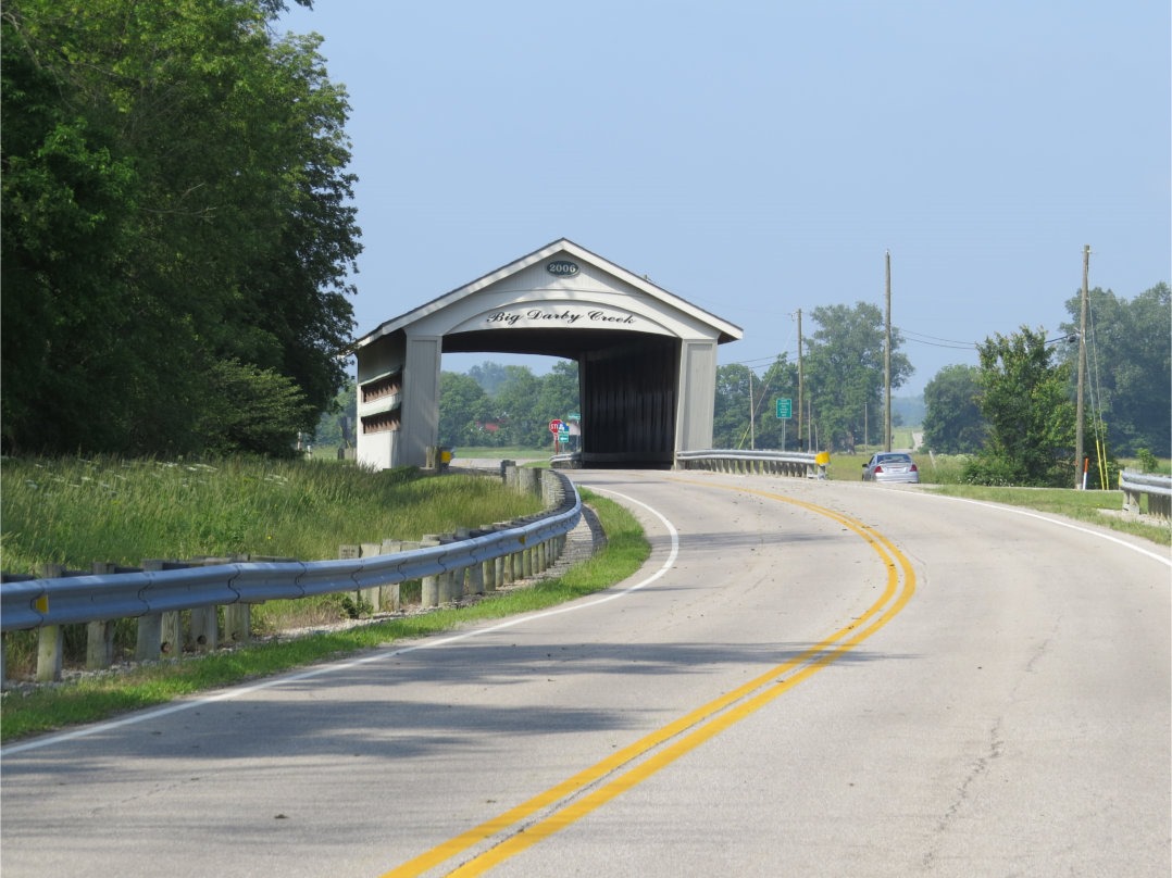 Here is something that has not stood up to anything; this is a not particularly impressive modern version of a covered bridge. Ohioans are oddly fascinated by their covered bridges, Covered bridges were a form of wooden bridge built in the United States more or less during the period 1790 to the mid 1800s. They are “covered” not to protect travelers but the wooden planks of the bridge itself, to prolong its life. I have found such widely varying numbers for the total number of such old bridges that have survived in Ohio that I can’t actually provide a number, but the range is probably somewhere between 120 and 170. For some reason, Ohio has a significant proportion of all the surviving covered bridges in the United States. For some reason, the vast majority of Ohio’s surviving covered bridges are in southern Ohio. Because of the fascination with covered bridges, it is not uncommon now for developers to build new covered bridges with modern materials in imitation of the originals. They hold none of the fascination that the originals do.