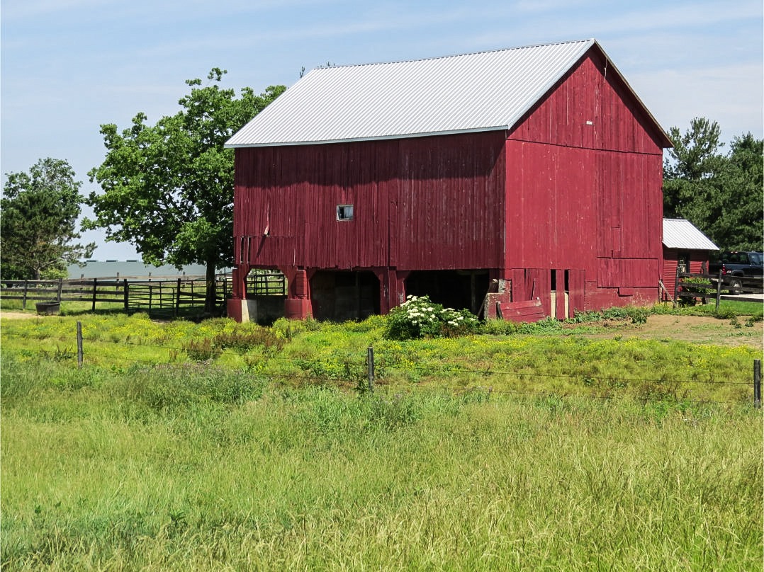 Next up we have this large and decidedly red barn, at least in part a livestock barn judging from the pasture that surrounds it.