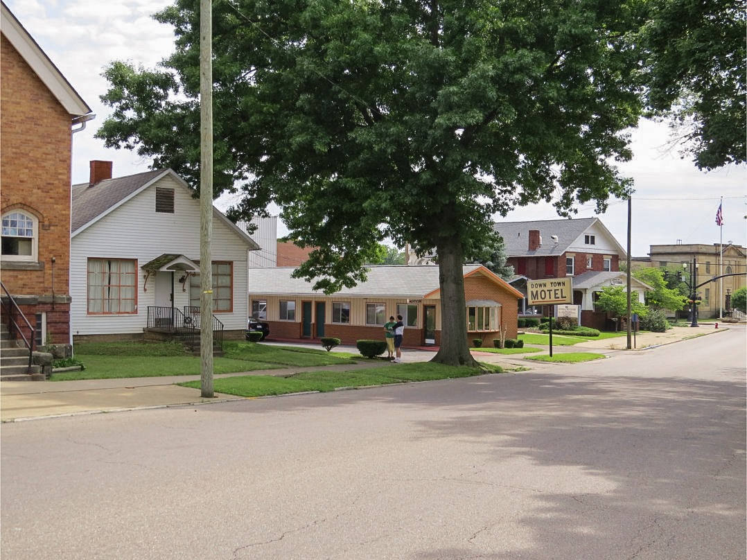 At last, my travels brought me to Coshocton, as travels in this region so often do. This town of 11,216 (salute!) is a nice town that unlike many other Ohio towns of its size has not experienced too much population loss in recent decades (its population hasn’t really changed all that much for a hundred years, oddly enough). This time I encountered a tiny little motel on Main Street dubbed the “Down Town Motel.” It is a rather odd place for one of these old motels. Perhaps back in the 1930s Main Street got more traffic (it seems rather sleepy today).