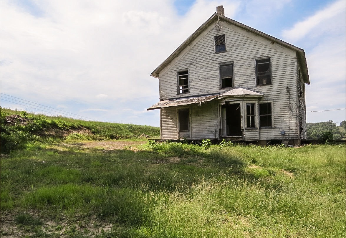 I drove up the old dirt driveway onto the property and took this picture in front of the house. This is my favorite picture of this blog entry. The abandoned house looks so desolate by itself on a seemingly bald and windswept hill. There are no trees, no outbuildings, nothing to keep the house company. It conveys a feeling of loneliness and decay that to me is quite striking.