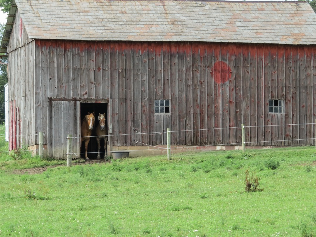 I loved these two curious horses peeking out of the barn to see what I was up to. Horses are definitely the most curious of the various types of livestock I encounter.