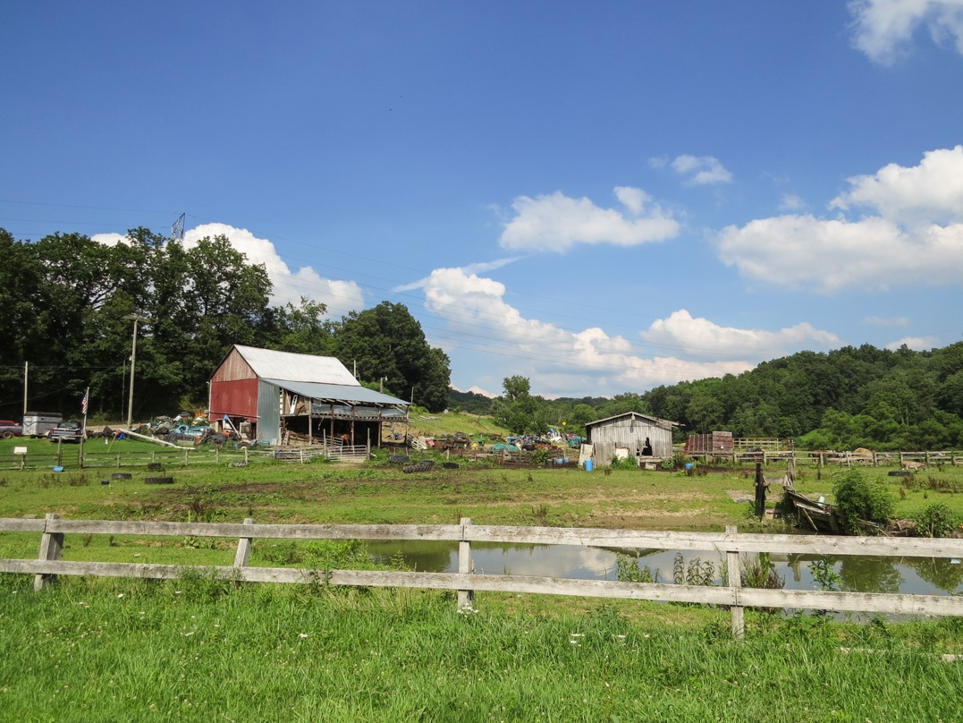In this neck of the woods, some people don’t really “store” thing at all; they just set them out somewhere, perhaps forever. Here we are looking into the “back end” of a pasture and livestock barn. You can see, when you click on the enlarged version of this photograph, that the grounds around the barn are littered with old vehicles, equipment, and every other odd thing.