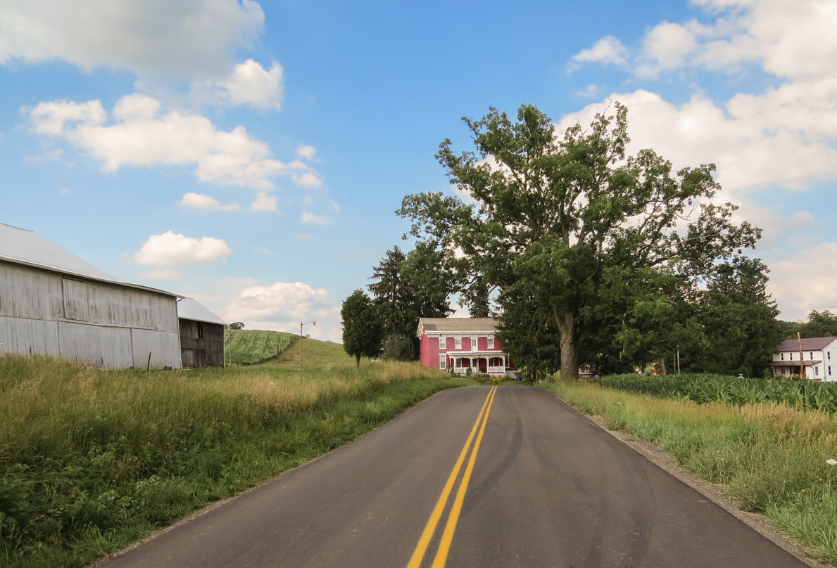 Before it bends, the road takes us to this nice old red farmhouse. With a few small changes, this scene could have looked much the same 150 years ago.