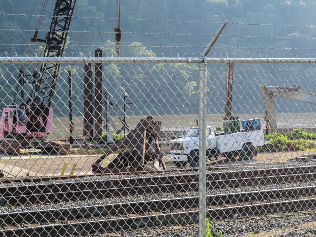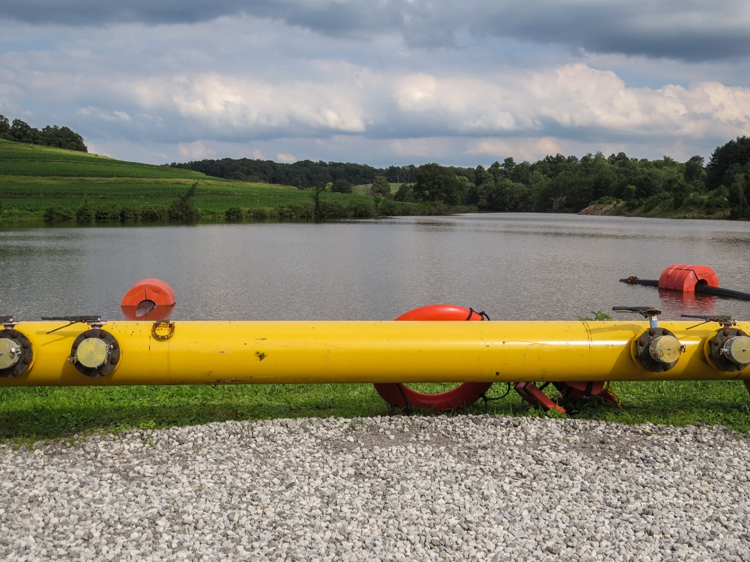 As I have mentioned in previous blog entries, eastern Ohio is being transformed by the shale oil/fracking boom. This was especially visible in the summer of 2013 as suddenly a spiderweb of pipelines began to be dug across this region of the state. In future years, these pipelines will be mostly underground and thus far less visible, but right at this moment one could frequently see them above ground, not yet buried, alongside the raw and exposed earth. Here a section of pipeline appears next to a small lake in eastern Ohio. I don’t know what lake it is; I never anything naming it.