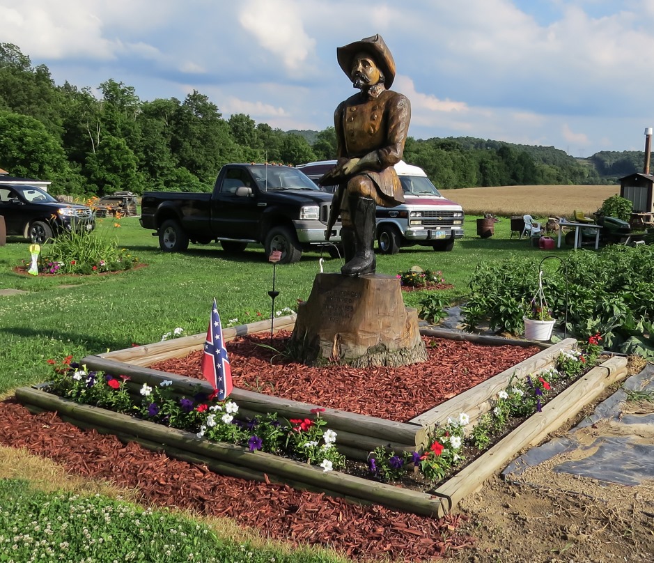 Because of the roadside signs, I knew I was somewhere along the Morgan trail. What I did not know was that I was virtually at its end. As I drove down State Route 518 I caught something out of the corner of my eye—it looked like a statue. I stopped the car and backed up. Sure enough, it was a statue—moreover, it was a tree sculpture. When I saw the Confederate flag in front of it I realized that it almost had to be a sculpture of John Hunt Morgan (below).