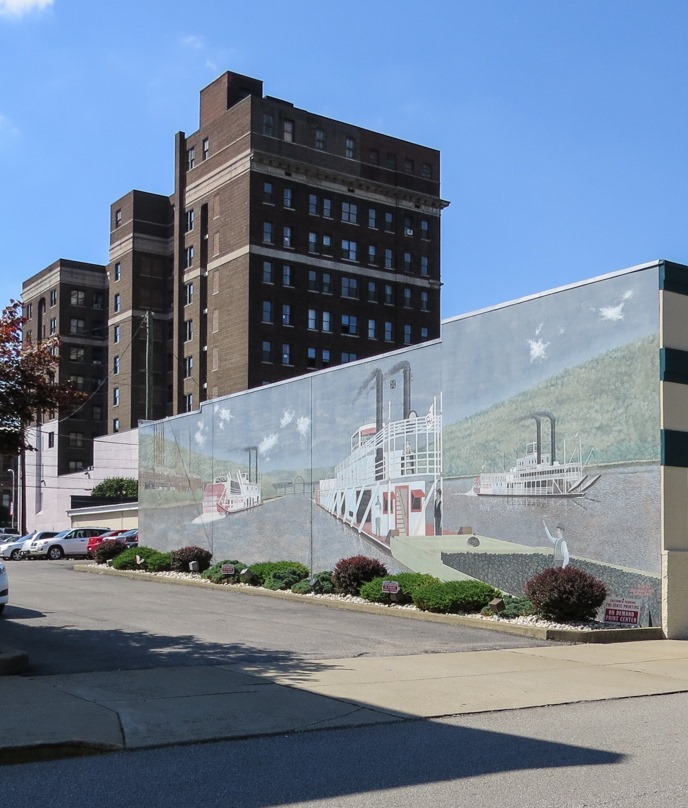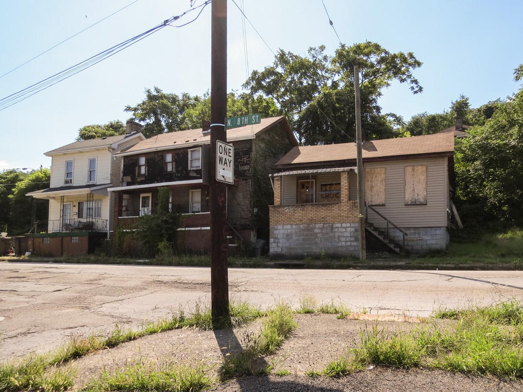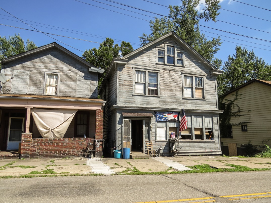 I reached Steubenville in the early summer evening of August 6; it was the turn-around point for my excursion up the Ohio River. Of Ohio’s rust belt towns along the Ohio River, Steubenville is perhaps the worst off. Where steel mills in other towns are shut down or idle, Steubenville’s is simply gone—demolished—leaving residents without even the pipe dream of it restarting. The population of Steubenville is 18,659 (salute!), which is less than half of what it was at its peak in 1940. Since then, it has experienced seven straight decades of population decline—including a 20 year stretch in which its population dropped faster than any other town or city in the U.S. Crime, poverty, and urban decay have all increased, as has corruption. Crooner Dean Martin, who grew up in Steubenville, would not recognize this version of his home town. Dilapidated houses, like the above examples, are the rule rather than the exception.