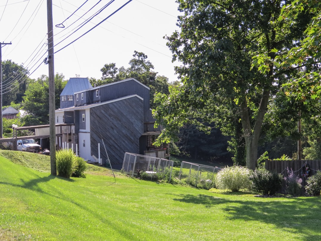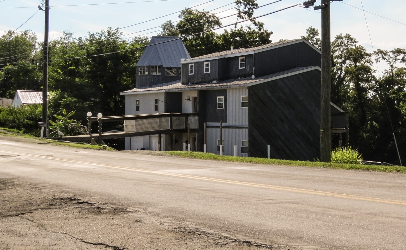 As I headed southwest from Steubenville, I found an even more interesting building alongside a country road. The ground sloped steeply downward from the road, but an enterprising architect built a large residence along the road anyway, with a bridge from the house to the road.