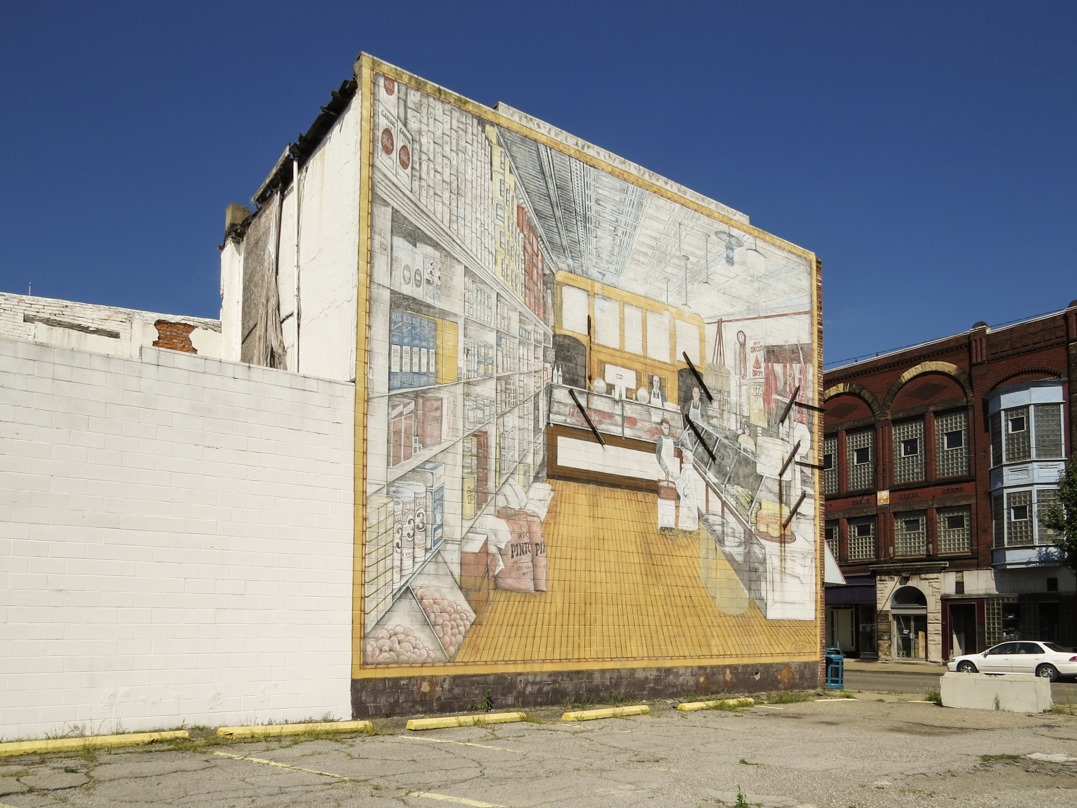 Sometimes it seems to me that the more depressed a town or city is, the more effort residents put into murals. Here, a mural of a store interior is far more pleasant than the exterior reality.