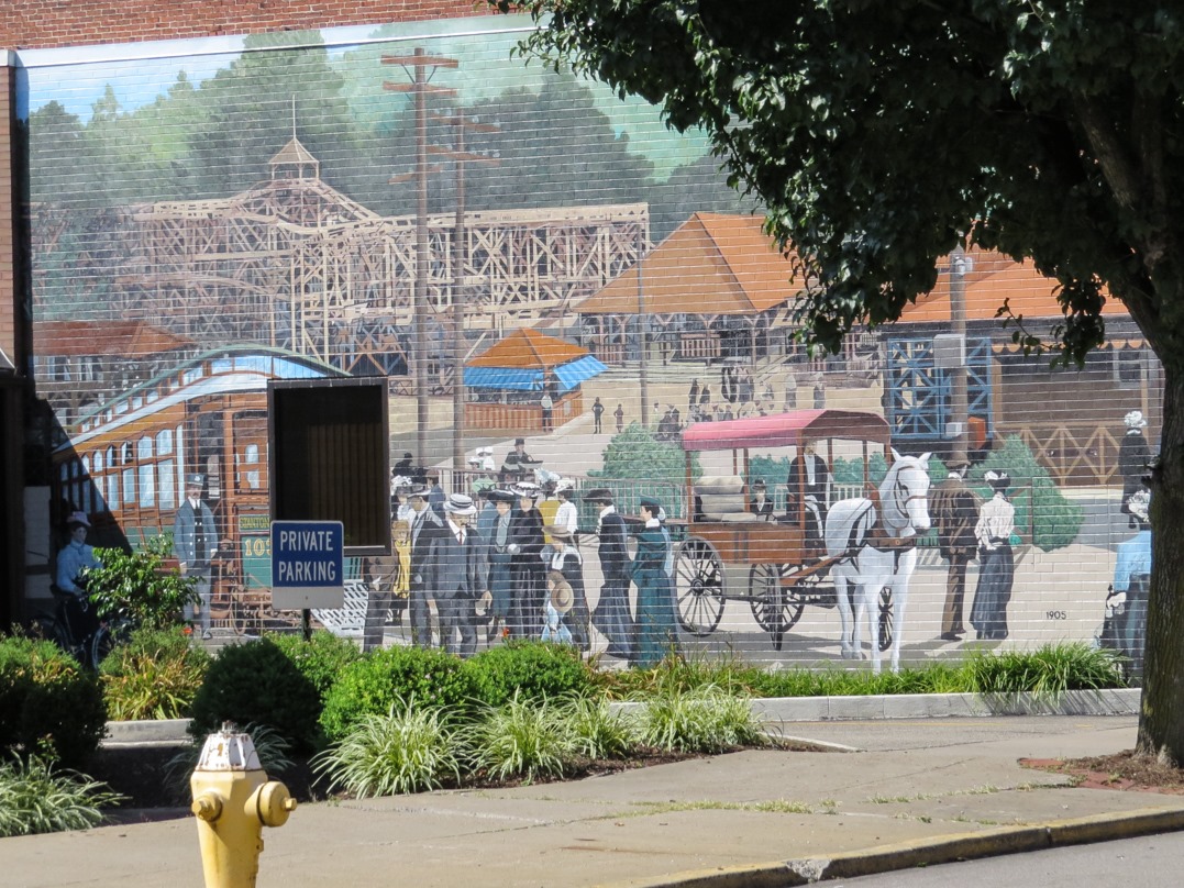 The murals all look to the past, to better days, such as this view of an amusement park.