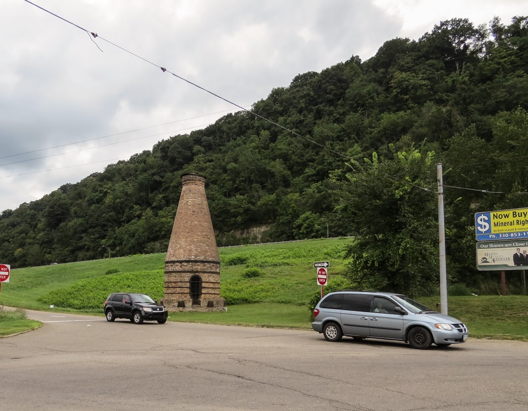 The old and the new.  The old is this original bottleneck kiln, a symbol of the importance of ceramics to Wellsville’s earlier history.  It is all that remains of the Acme Craft Pottery company (a building once surrounded the kiln), which dates back to the 1920s, thought the kiln itself is probably older than that.  The kiln is just off the highway that traces the Ohio River, which is why the building is no longer in existence.  And the new?  That sign on the right, offering to buy “mineral rights,” which is part of the fracking boom in Ohio.