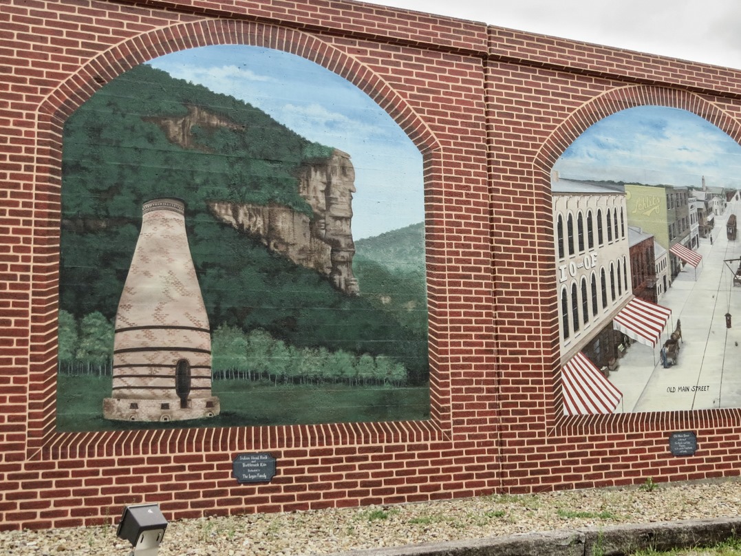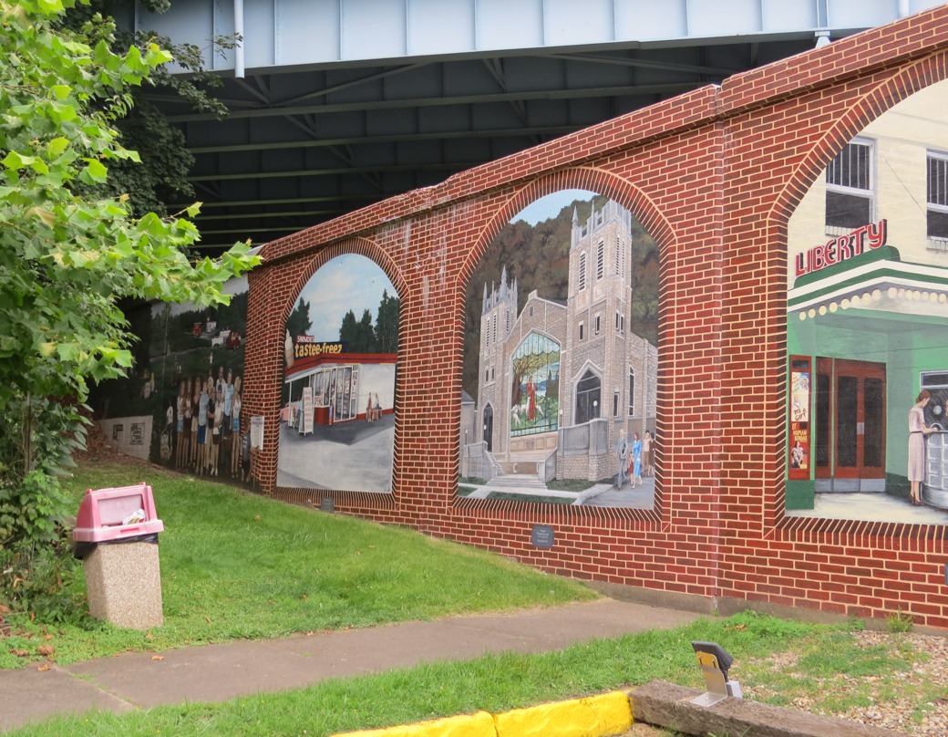 Not far away, underneath the highway, are the Wellsville Flood Wall Murals, painted by Gina Hampson in 2005, which show scenes from Wellsville’s happier past.