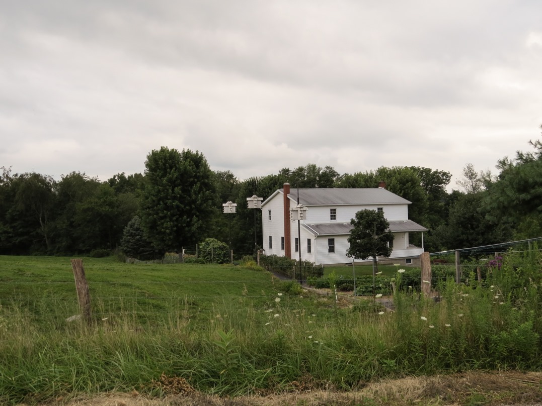 Here’s an Amish house (I was in “Amish country” by this time. It is easy to tell when you are getting into Amish country, because you start seeing horse manure on the roads (I actually took a picture of that, but decided not to share; I also decided not to share photos of a nearby sewage treatment plant; you’re welcome). So many Amish houses fit a “type”: massive, sturdy construction; painted white; grey cinder block lower level/basement; vegetable garden; clothesline, birdhouses. And, of course, no electric lines. This is missing a few, but has the rest.