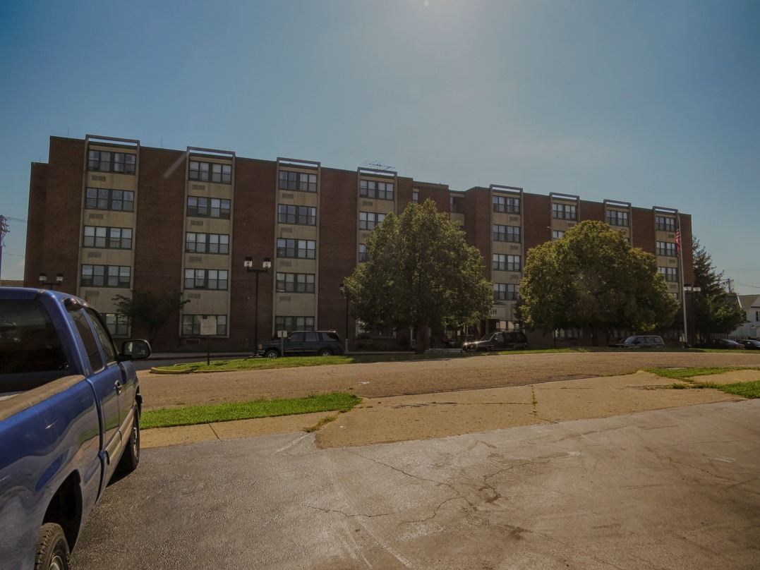 A public housing high-rise on South High Street, immediately identifiable as such from the architecture. It was a very sunny day, although it got more cloudy as the day went on.