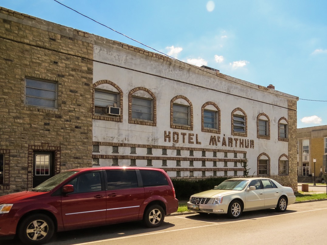 Heading south from Hocking County, I soon ended up in the village of McArthur (population 1,701, salute!), named after a War of 1812 general who was kind of an asshole. Here one can find the Hotel McArthur, a tiny hotel (12 rooms) that dates from around 1840. It was worth $1,913 in 1850. At different times, it was called the Hulbert House, the Will House, the Lantz-Hamilton House, and the Lantz-Hamilton Hotel, before becoming the Hotel McArthur in 1946. Today it is more of a bar than a hotel. It has been repeatedly cited for various liquor violations and overall seems to have a pretty seedy reputation.