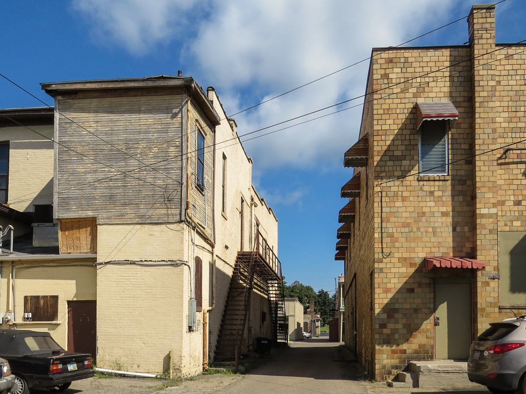 Sometimes the backs or sides of buildings are more interesting than the front. Two things about this scene in particular attracted my attention—the odd wooden addition on the 2nd floor of the building on the left, and the metal staircase on the side of the same building.