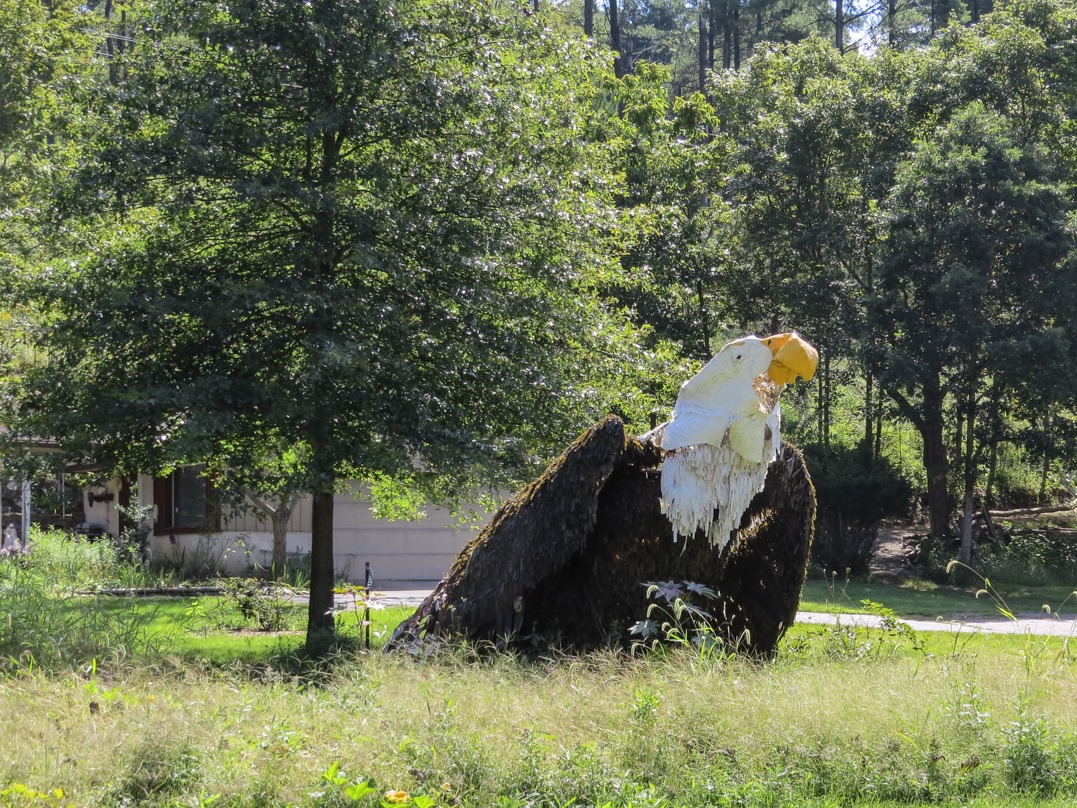 I headed south from Logan—I think along SR 93—and soon encountered my odd event for the day. In the front yard of a house in rural southern Ohio I found a huge, crumbling statue of a bald eagle. It seemed to be built on a wire frame, with plaster and other materials put on the frame and painted. It seemed fairly old and was certainly well-worn, with plaster falling off, revealing the wire structure beneath. So, here’s the obvious question: why on earth had someone created a huge statue of an eagle on their front lawn? Was the local high school mascot an eagle? Did someone get struck by an uncontrollable burst of patriotism?