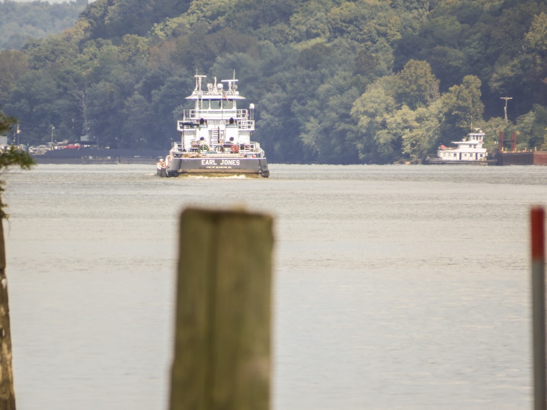 The Ohio River is very much a navigable river. Much of its traffic consists of tugboats and barges full of coal or other materials. But there are also fishing boats and tourist boats and many private craft. Here, chugging upriver away from me, is the Earl Jones, a “towing vessel” (tugboat, I presume) built in 1973 in Delaware but currently owned by a company out of Houston, Texas. It is a camel hair’s longer than 126 feet and has a gross tonnage of 486 tons.