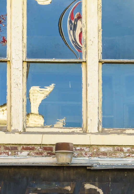 The upper windows of one of those shops catch the reflection of an American flag waving across the street. I thought it made an interesting abstract shot.