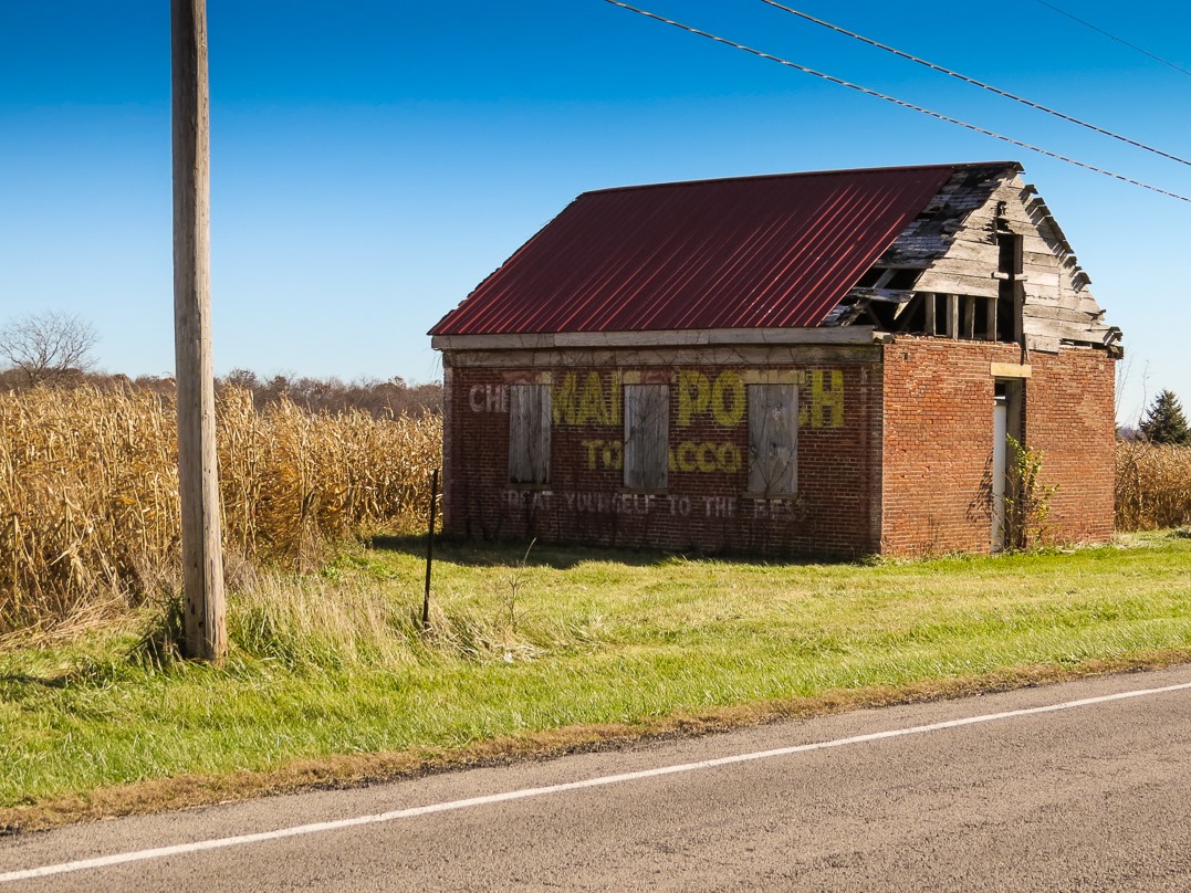 I find the Mail Pouch chewing tobacco advertisement here rather interesting, considering that this building was almost certainly once a one-room schoolhouse.