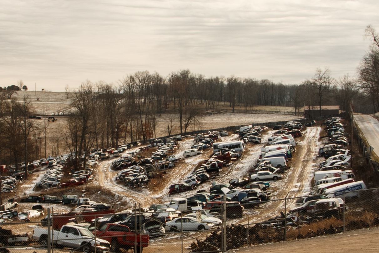 I have to admit that I was tickled pink to come across a massive automobile junkyard near Hopewell, Ohio (Miller’s Auto Wrecking). I’ve mentioned in a past blog entry that the high walls around such junkyards (designed to prevent theft) were always irritating to me as a kid, because I could never see all the cars. But this junkyard is situated in a bowl-shaped depression with a road running right through the middle of it, allowing the passer-by a wonderful glimpse into this vehicular graveyard.