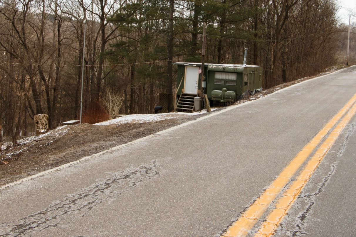 After going through Cambridge, I began to head back, through pretty heavily wooded Guernsey County. Along the way, perched next to the road on the edge of a steep slope down to a creek below, was this structure. I have mentioned before how fascinated I am by these hybrid structures that combine cabin and travel trailer and this was a perfect specimen.