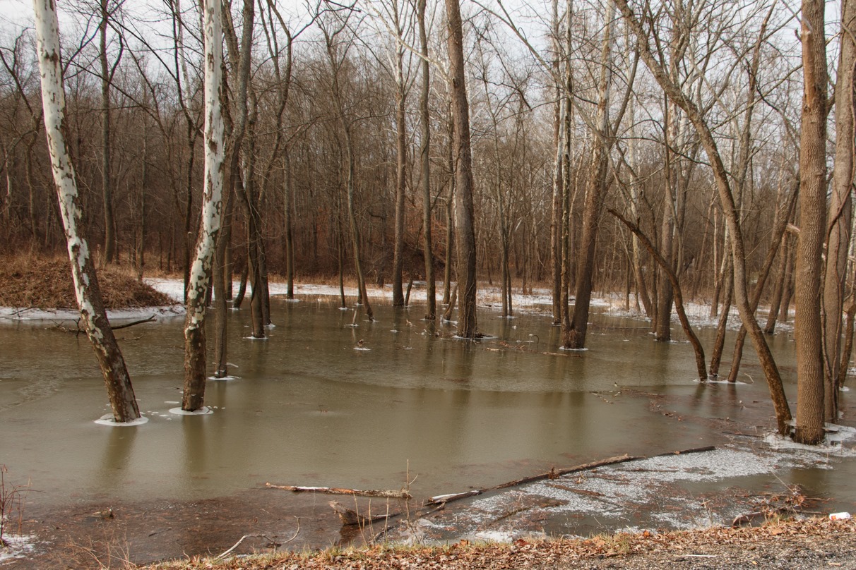 The temperature was low enough that shallow flood waters were often frozen over. as in this low-lying area.