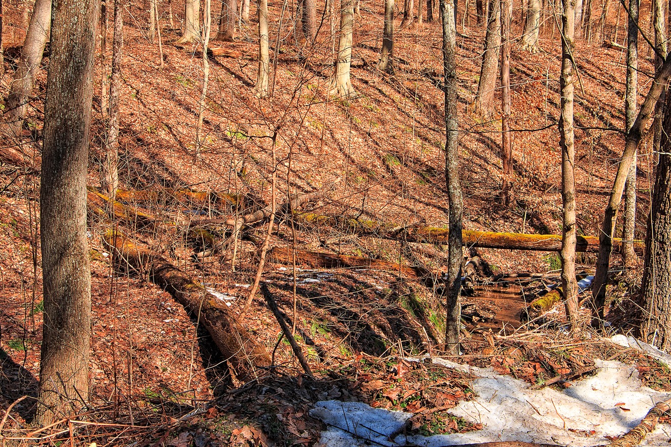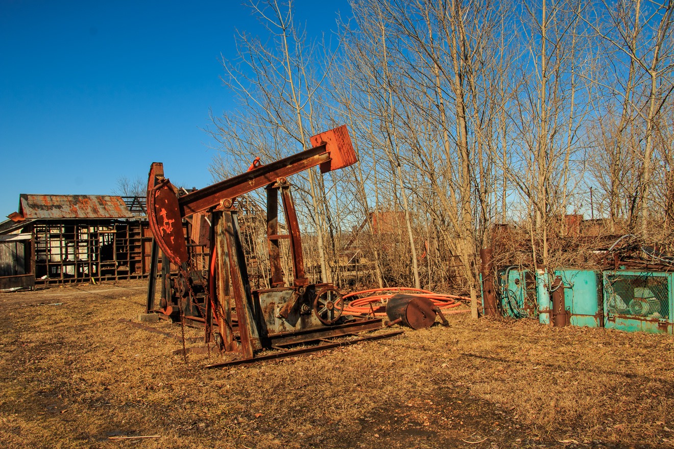 Since this is southeastern Ohio, naturally there is oil. For more than a century before fracking, oil has been pumped out of these lands—with the result that the detritus of oil drilling can be found everywhere, as with this abandoned old pump rig.