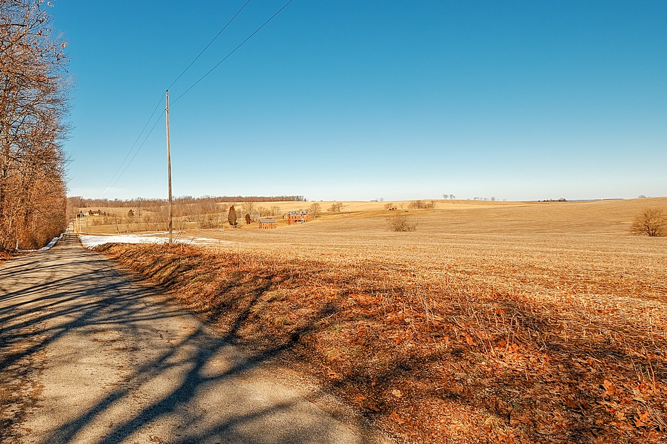 The above photograph shows one of the approaches to Mud House Mansion (there are basically only two—coming up this road or going down it on the other side). Mud House Mansion (actually a cluster of buildings, with one prominent one) is fascinating but what is frustrating is that there are only a couple of spots from which you can take photographs of it (it is not possible to go on the property itself), so the angles are always going to look the same, unless you have a drone. It is the time of year and the time of day that will make one’s photographs different. In the summer, the view above, with the Mud buildings distant specks (though this was very wide angle lens), is not available, as growing or mature corn obscures this view. I can say, writing this a year later, that I have returned to Mud House Mansion at other times since these photographs were taken, and so will be able to post some much more verdant views.