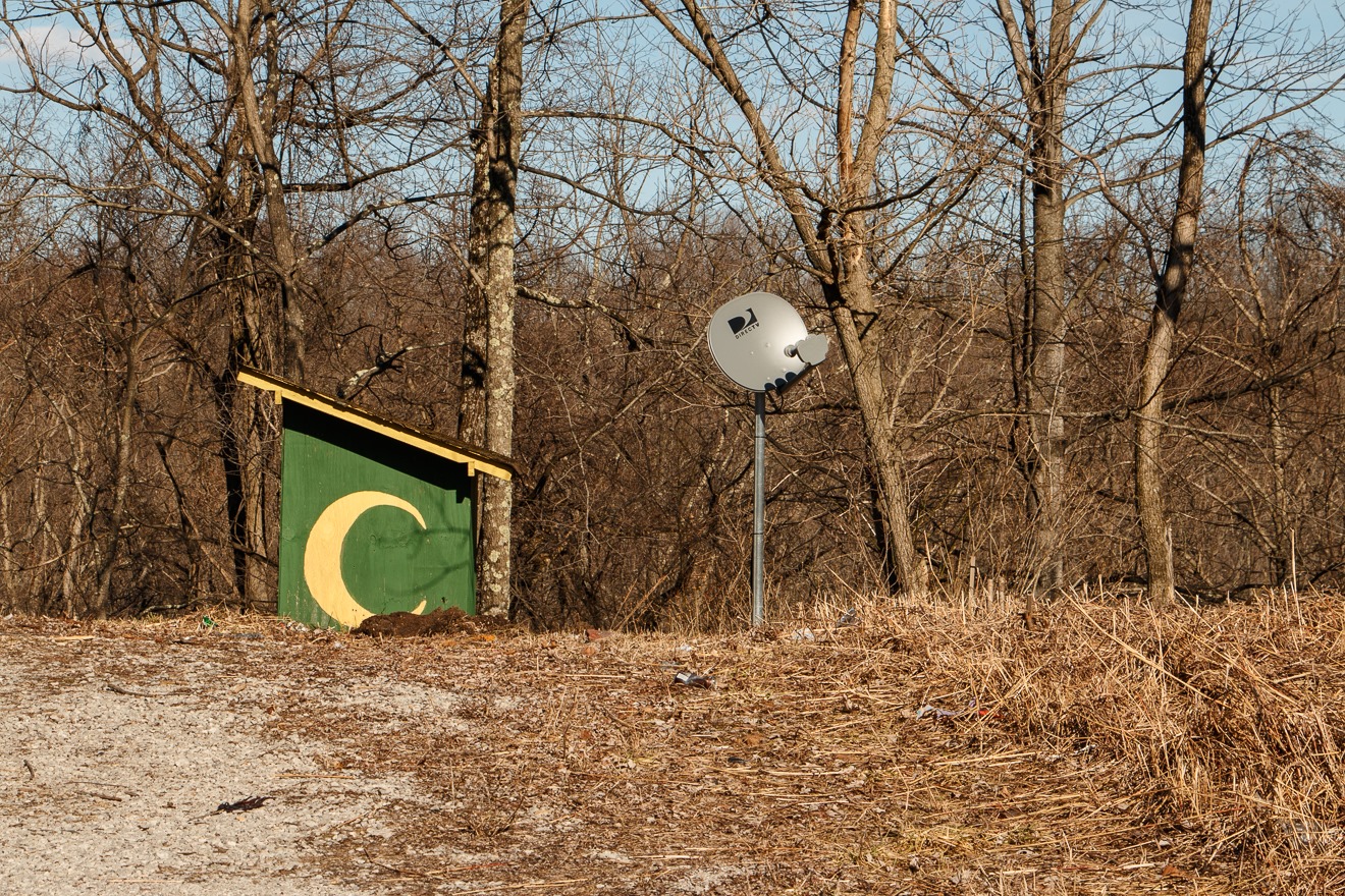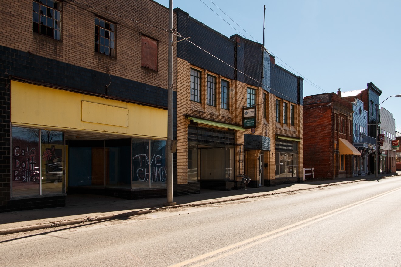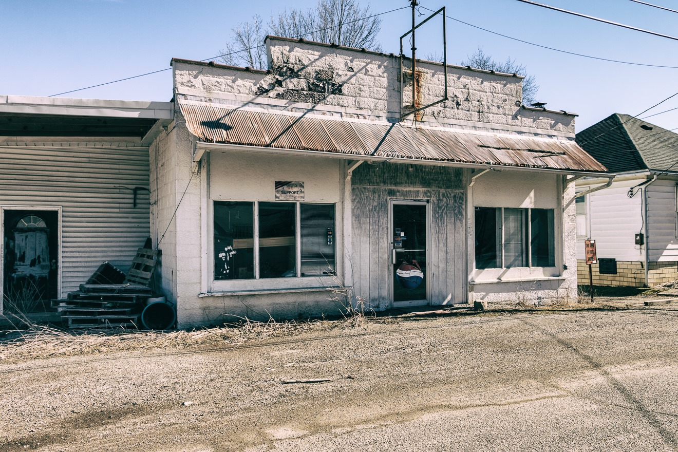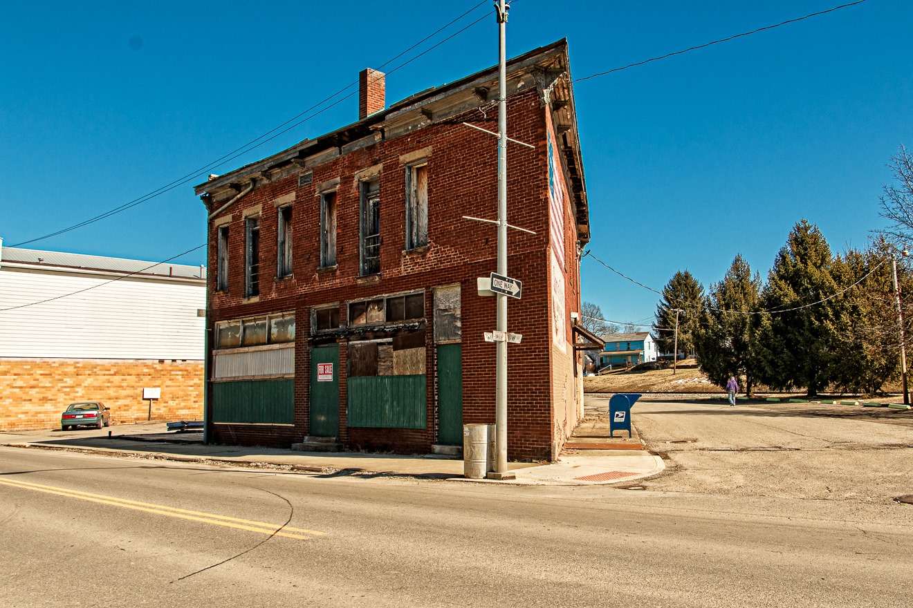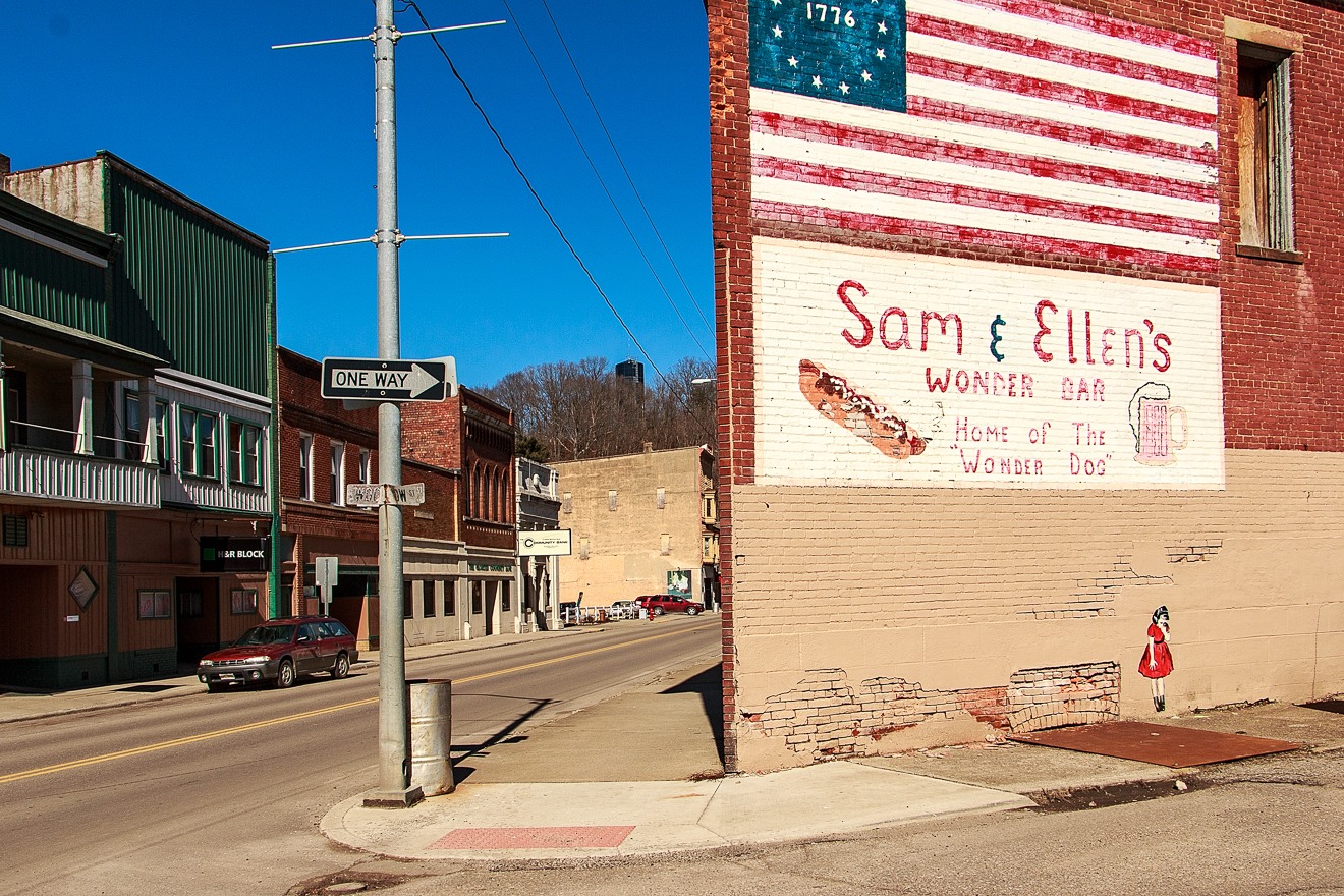 Sam & Ellen’s Wonder Bar: Home of the “Wonder Dog.” Sign on the side of the triangular building. Sadly, despite their wondrous nature, the bar and its dogs are no more. A writer from the New Yorker noticed this sign in 2008 while writing a story on the presidential election in Ohio. He wrote of Glouster: “A coal-mining town with a population of fewer than two thousand (and falling), [Glouster] lies hidden amid the gentle slopes and thick woods of southeastern Ohio’s Appalachian hills. If the state is dying, Glouster was long ago left for dead. Over the past few decades, it has lost its Baptist church, grocery store, railroad depot, parking meters, four car dealerships, ten of its dozen bars, and—crucially—all but one of its deep mines. It’s become the kind of town where several generations of white families live on welfare, and marijuana is the local cash crop.”