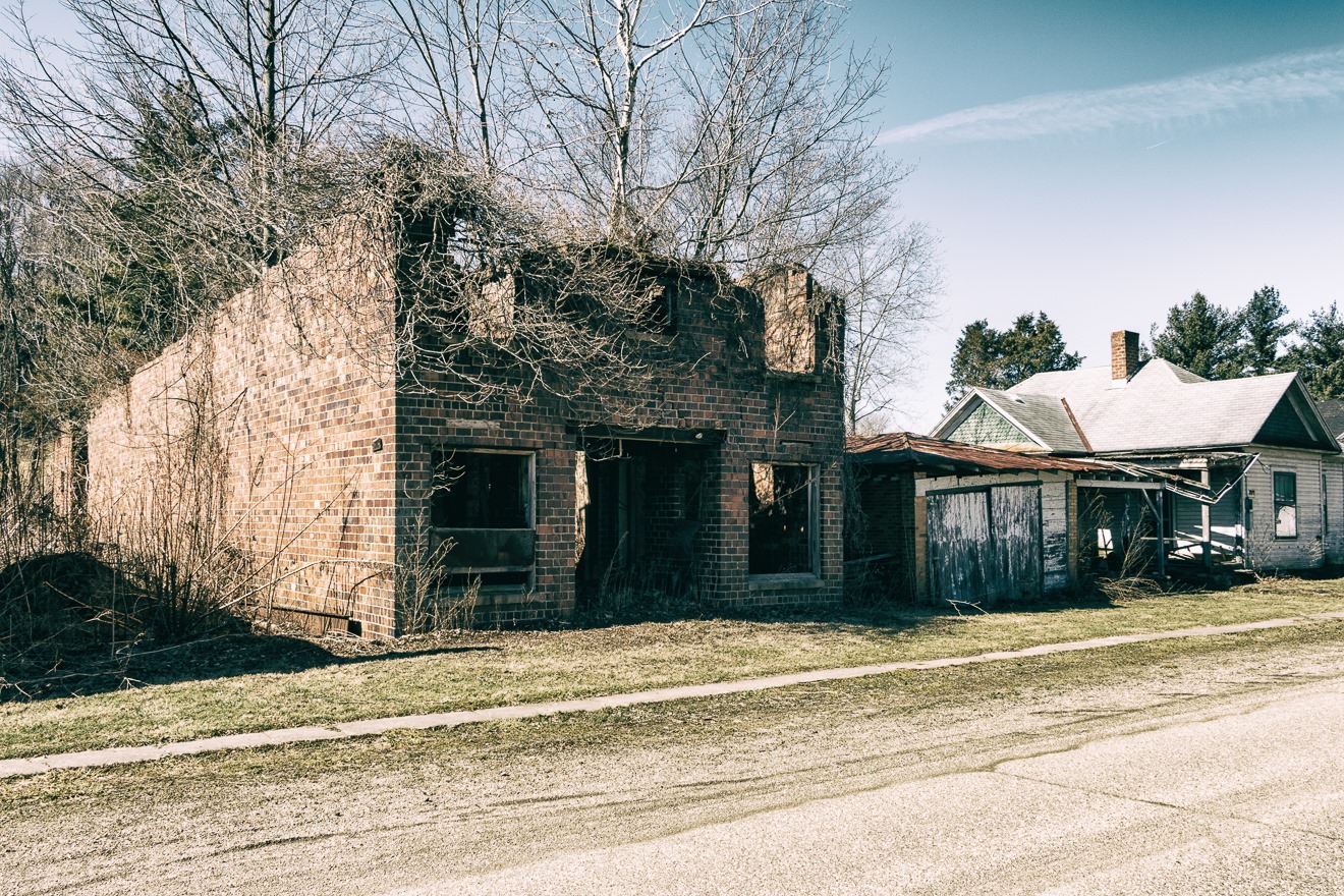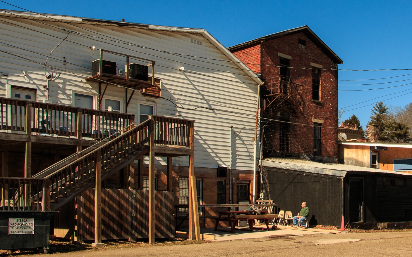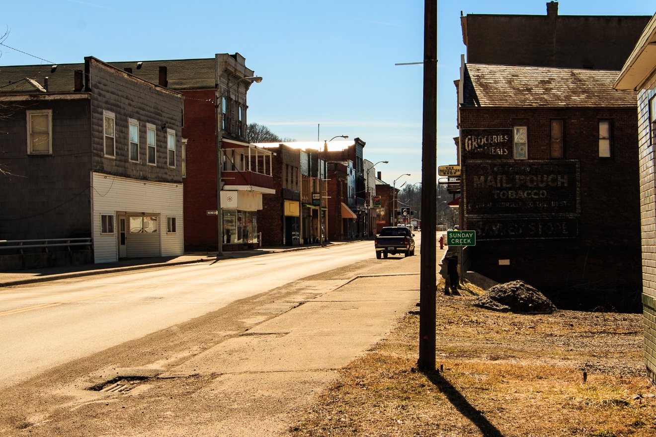 More backs of buildings. Here we are looking across Sunday Creek at the Mail Pouch building we saw earlier. It looks even more desolate from this vantage point.