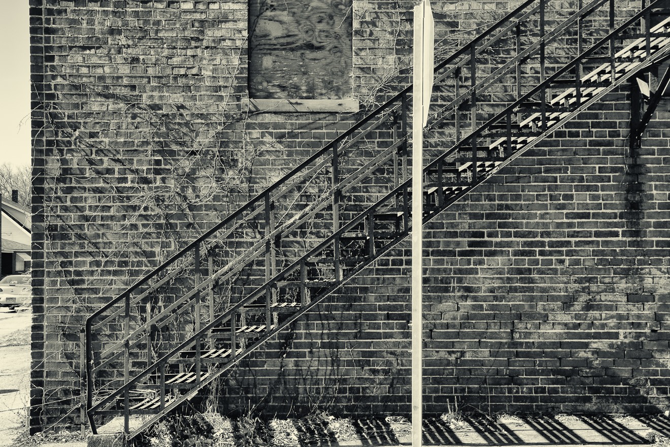 I liked the abstract patterns made by the metal stairs, the dead vines, and the brickwork on this building.