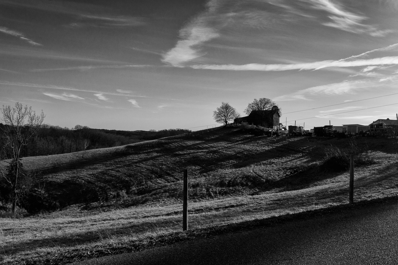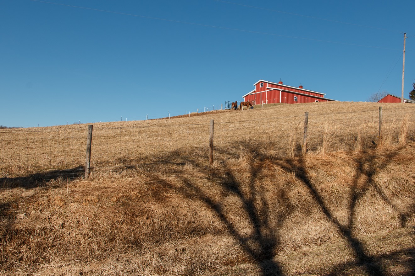 I like this rather sumptuous pastoral shot, with the horses and the barn on the horizon, sandwiched between a deep sky and a well-trodden pasture.