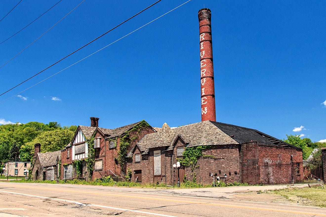 This brings us at last to East Liverpool, Ohio, an old rust belt town along the Ohio River, which I first visited in 2013.  It is situated along the Ohio River where Ohio, West Virginia and Pennsylvania meet.  It has suffered considerably over the years, reaching a peak population of a bit over 24,000 in 1950 and declining since (population today is only around 11,000).  A quarter of the population is below the poverty line.  The building above, which I previously photographed in 2013, is the old Crockery City Brewing & Ice Company.  See the other blog entry for pictures of the entire building.  This derelict building is quite prominent for those coming into town from the south, so I took another photo, just because.  This time I focused only on the top of this one-stately building, where you can see how nature is reclaiming it, with trees growing even on the top floors of the building.