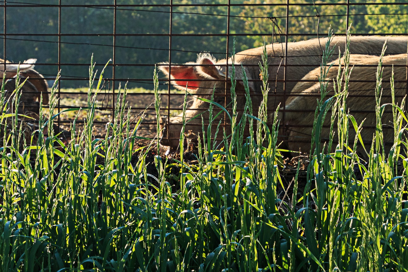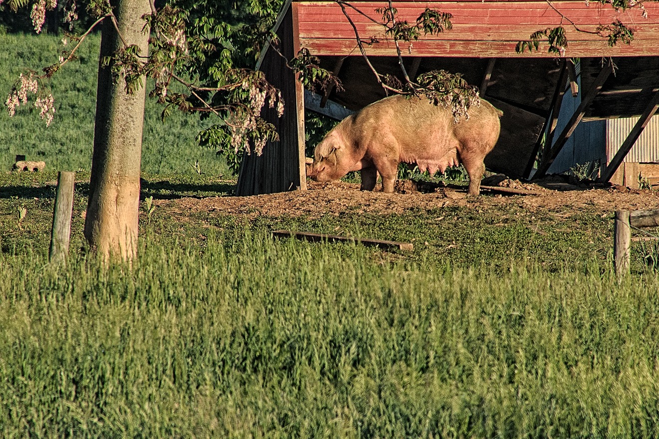 Oddly, after my excursions had been swine-free until this day, just a few minutes after taking the previous photographs I came across some more pigs on another farm. Here we see a mama pig chowing down. Pig teats seem so less aesthetically appealing to me than cow teats—they look more like cave formations. Stalactits.