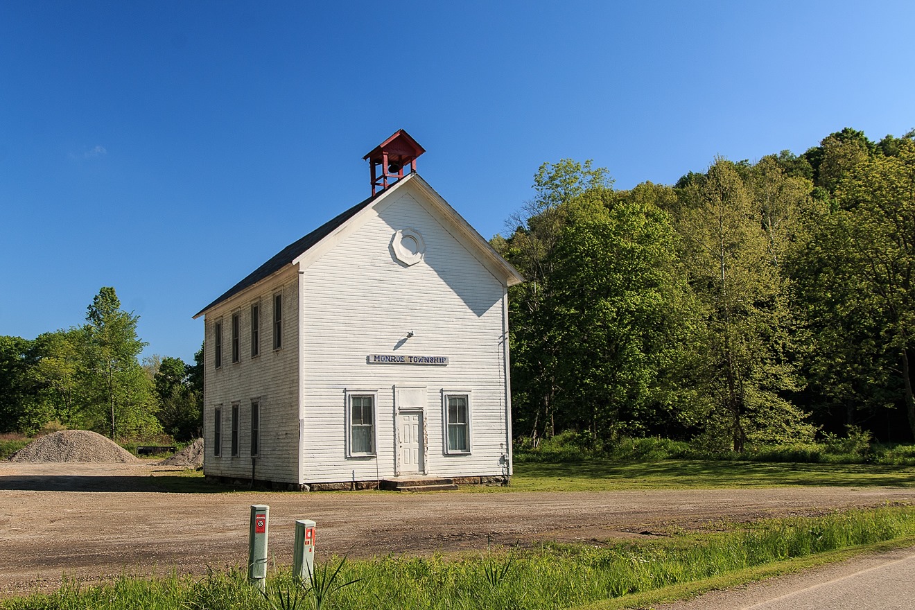 Here is the township building for Monroe Township in Guernsey County, Ohio. Townships are a bizarre level of government in Ohio (and much of the midwest, stemming originally from the Northwest Ordinances of the late 1700s). They are sort of like mini-counties within a county. Depending on the area, they may provide some road maintenance services, fire services, police services, or other functions. Some townships in Ohio operate police departments that exist for no purpose other than to run speed traps in order to bring in money; some of these have been disbanded by the legislature after scandals, but others still exist. Unlike cities or counties, nothing precludes townships in different counties from having the same name, so confusingly, there are 22 different “Monroe Townships” in Ohio. This particular township is in an entirely rural area and has a population of less than 600.
