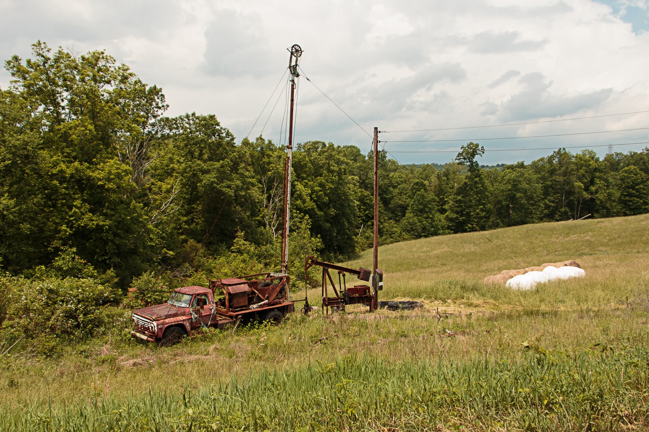 A reminder that this region of Ohio has been pumping oil and natural gas for well over a century.  Now, of course, fracking is all the rage.  In late 2014, about six months after I took this photograph, a plugged natural gas well owned by Triad Hunter blew out in Monroe County not too far from here, shooting a huge plume of natural gas high into the air—and into the surrounding region, forcing several dozen homes to be evacuated.  It took workers some 10 days to cap the well again.