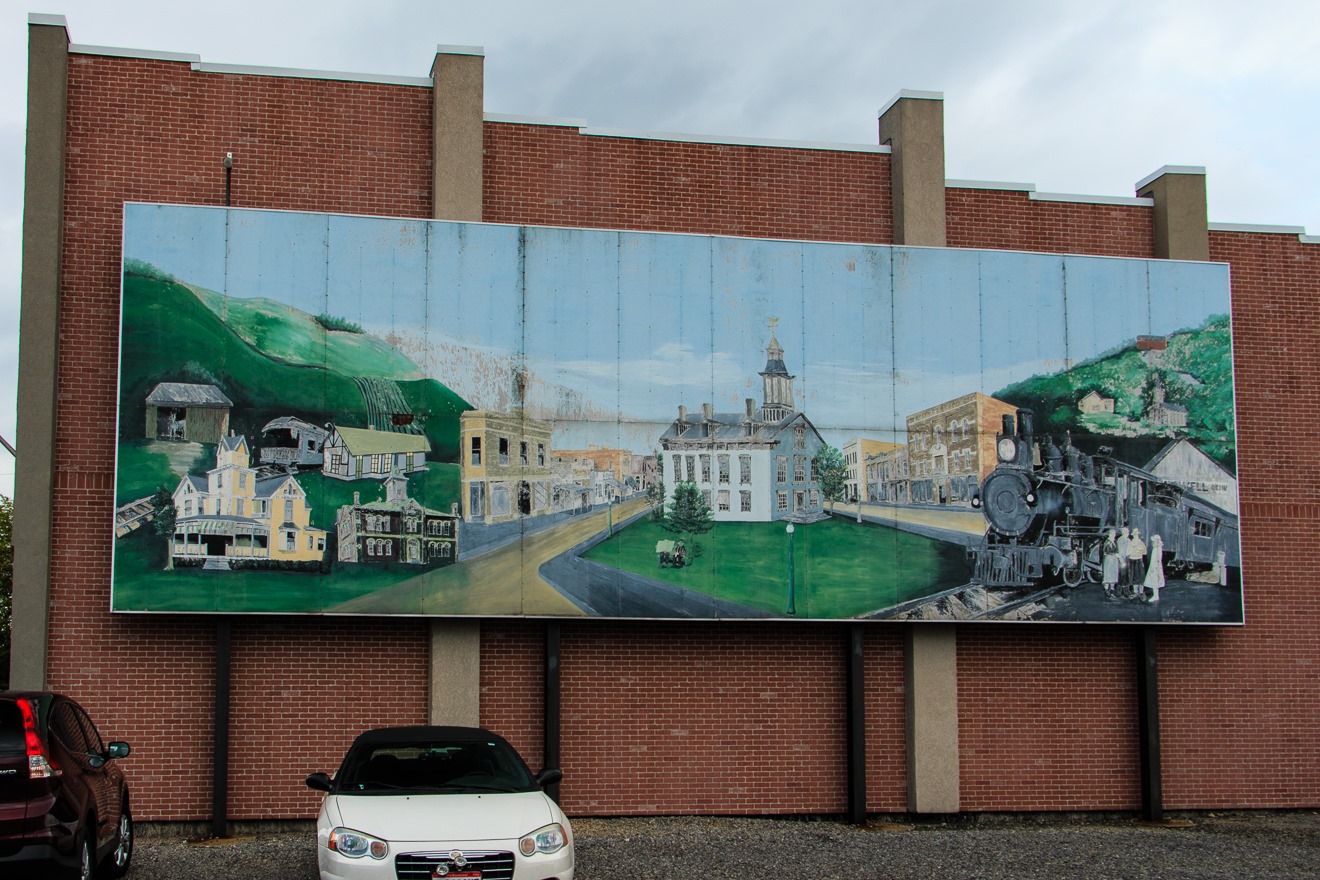 I soon crossed the highway and was in Caldwell, Ohio, a small village (population 1,748, salute!) in Noble County, where it is the county seat (which says something about how rural Noble County is).  It seems like every hamlet, village or town in Ohio has a town mural depicting sights and wonderments of the place’s past.  Some are done by professional artists, often local, while others are done by nonprofessionals, including students.  Caldwell’s mural may  not reach the pinnacle of town mural artwork, but it tries.  Like most towns and villages in the region, Caldwell is shrinking.